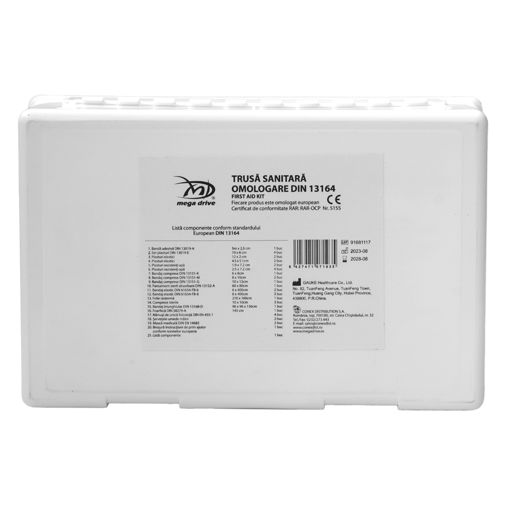 Trusa medicala de prim ajutor, in conformitate cu DIN 13164, vesta reflectorizanta in conformitate cu EN ISO 20471:2013 si triunghi reflectorizant cu marcaj European. Borseta impermeabila de culoare portocalie. Valabilitate 5 ani.